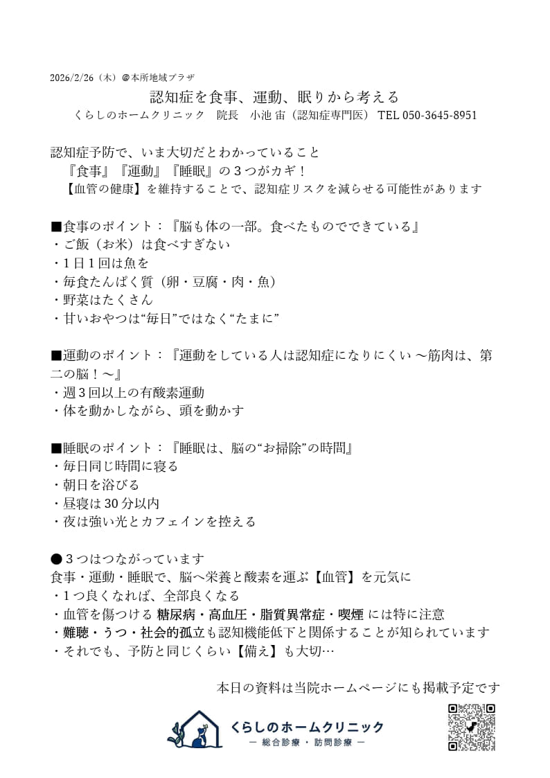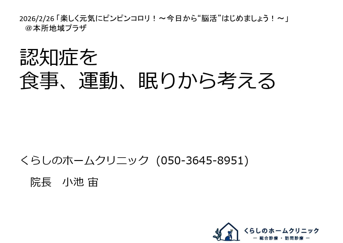 去る2026年2月26日、当院のある墨田区:本所地域プラザにて当院院長の小池宙による近隣住民の方に向けて認知症の講義をさせていただきました。