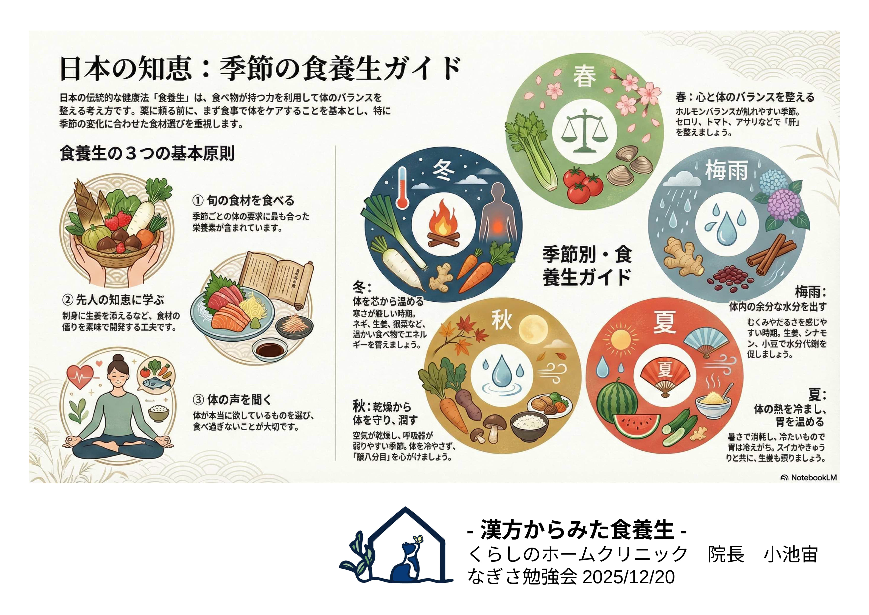 今回は当院で行っている【総合診療】、また取り入れている東洋医学、とりわけ【漢方から見た食養生】と題して基礎的な部分を中心にお話をさせていただきました。